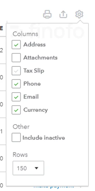 This allows you to select which fields to export, such as address, attachments, tax slip, phone, email, and currency.
