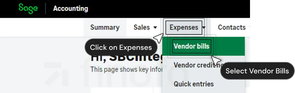Start by logging into your Sage Accounting or Business Cloud account. From the main navigation bar, select 'Expenses' and then from the dropdown menu, choose 'Vendor Bills'.