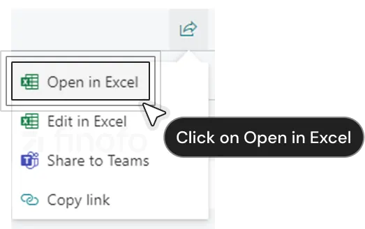 Locate the export icon at the top right of the screen and select "Open in Excel." This action will initiate the download of an Excel (.xlsx) file to your computer.
