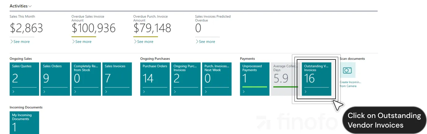 From your Dynamics 365 dashboard, navigate to the “Outstanding Vendor Invoices” section.