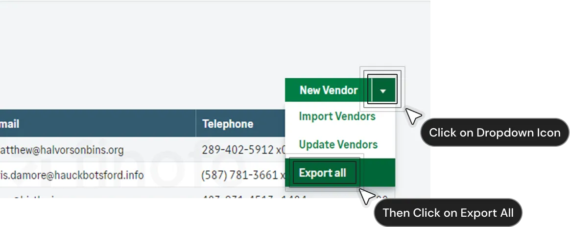 You will be redirected to the vendors page, where all vendor information is displayed. In the top right corner of the page, next to the 'New Vendor' button, click on the dropdown and select the 'Export all' option.