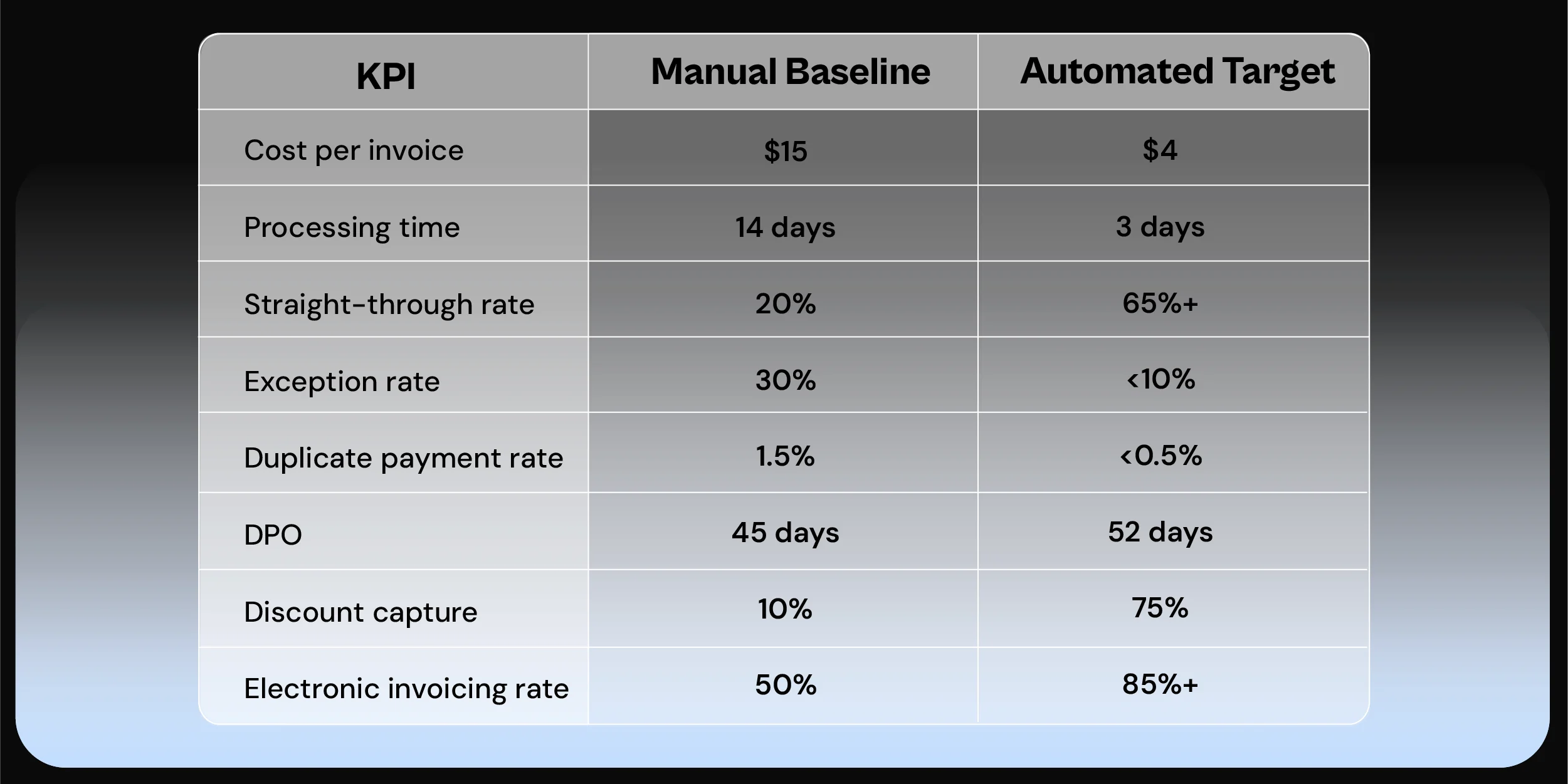 Top-performing automated AP teams often gain 3–7 days in DPO, improving cash flow.