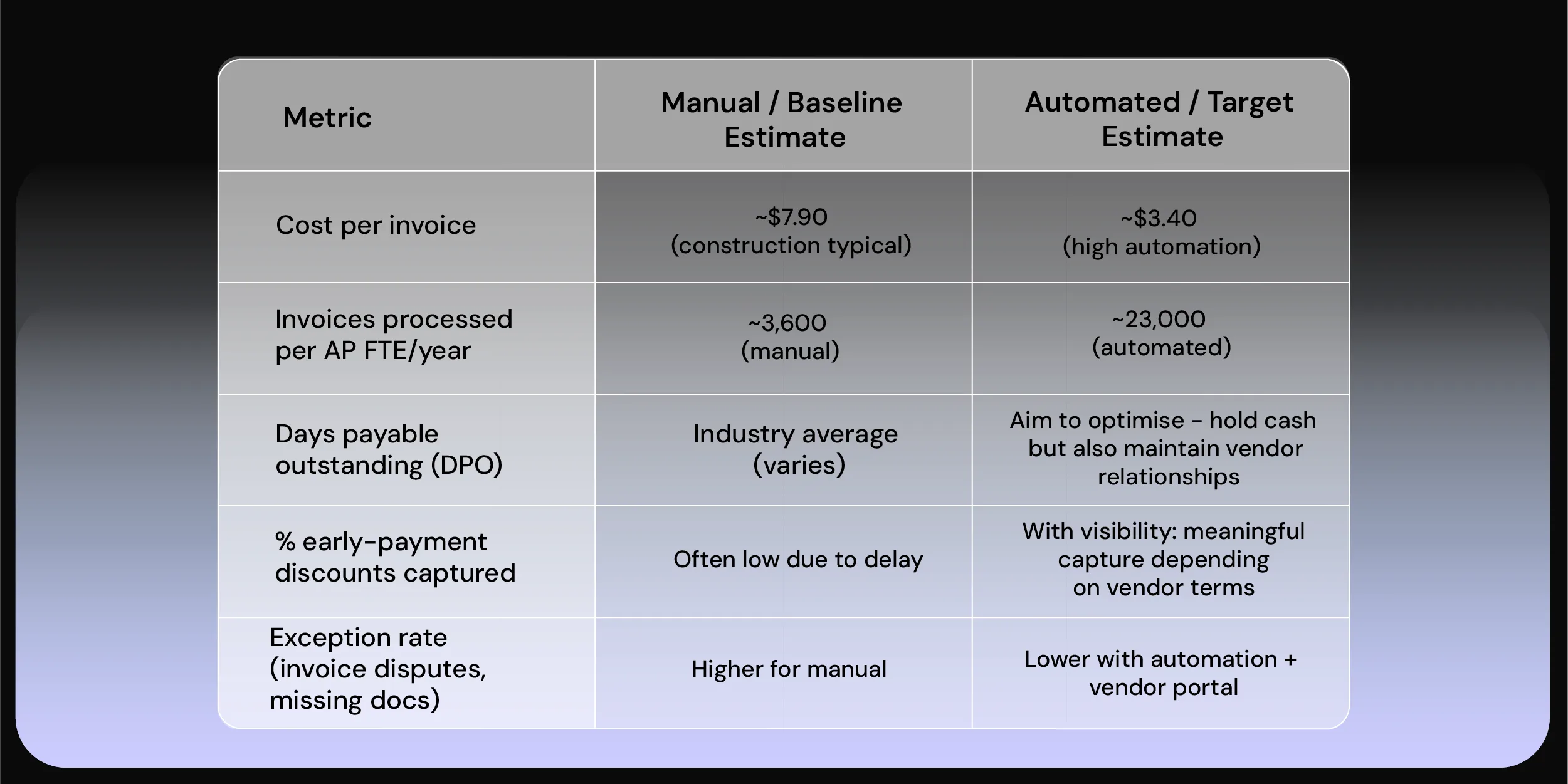 - Cost per invoice reduction: ~$7.90 per invoice for manual vs ~$3.40 for highly automated.