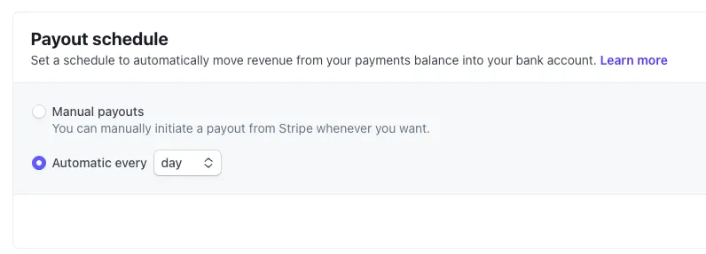 - Go to your Stripe Dashboard → Settings → Business settings → External payout accounts and scheduling