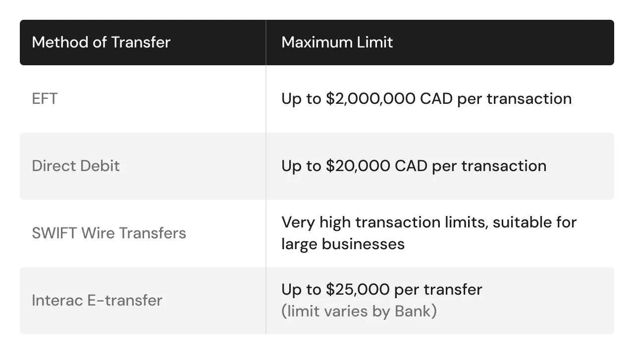 For Canadian Businesses: When funding CAD accounts, Wise supports Interac e-Transfer, Wire Transfers, and Direct Debit as funding options, but does not offer EFT. For instance, a $25,000 CAD Interac e-Transfer (the maximum limit) incurs a fee of approximately $30 CAD (14 basis points average), while Wire Transfers cost $1 per transaction. Direct Debit is available for transactions up to $9,500 CAD.