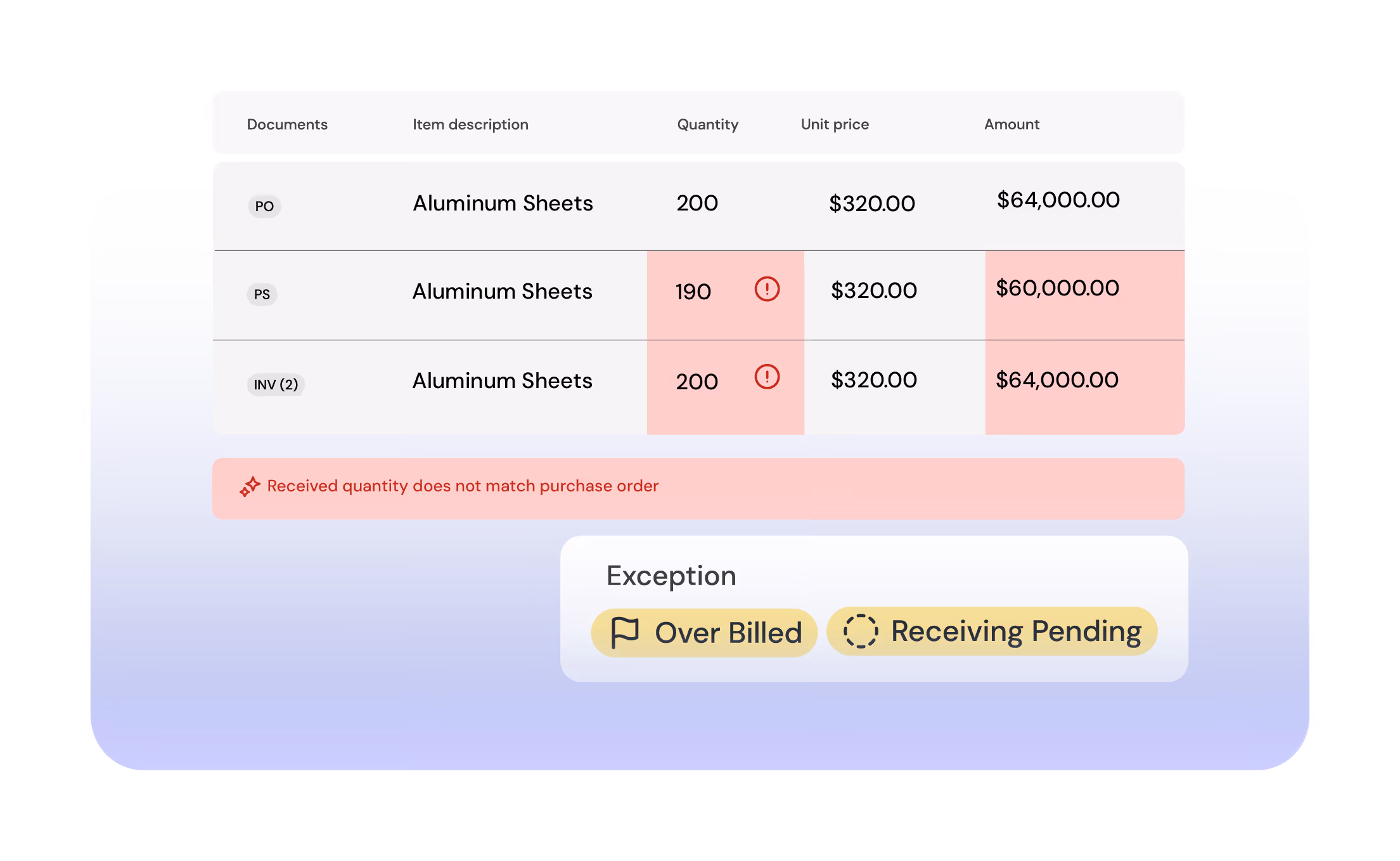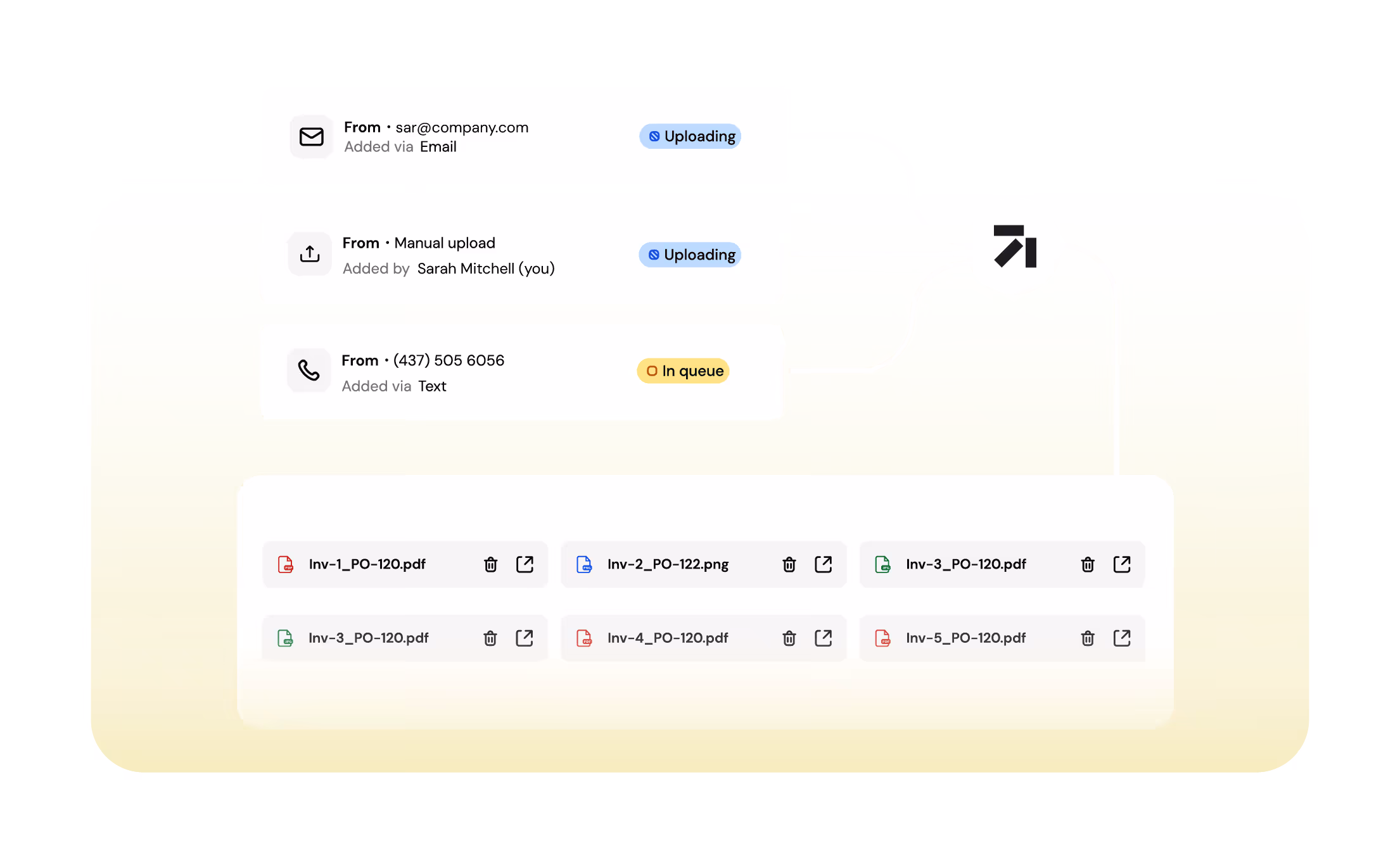 Ingest invoices, POs, and packing slips from email or upload. Centralized, searchable and ready for automation.