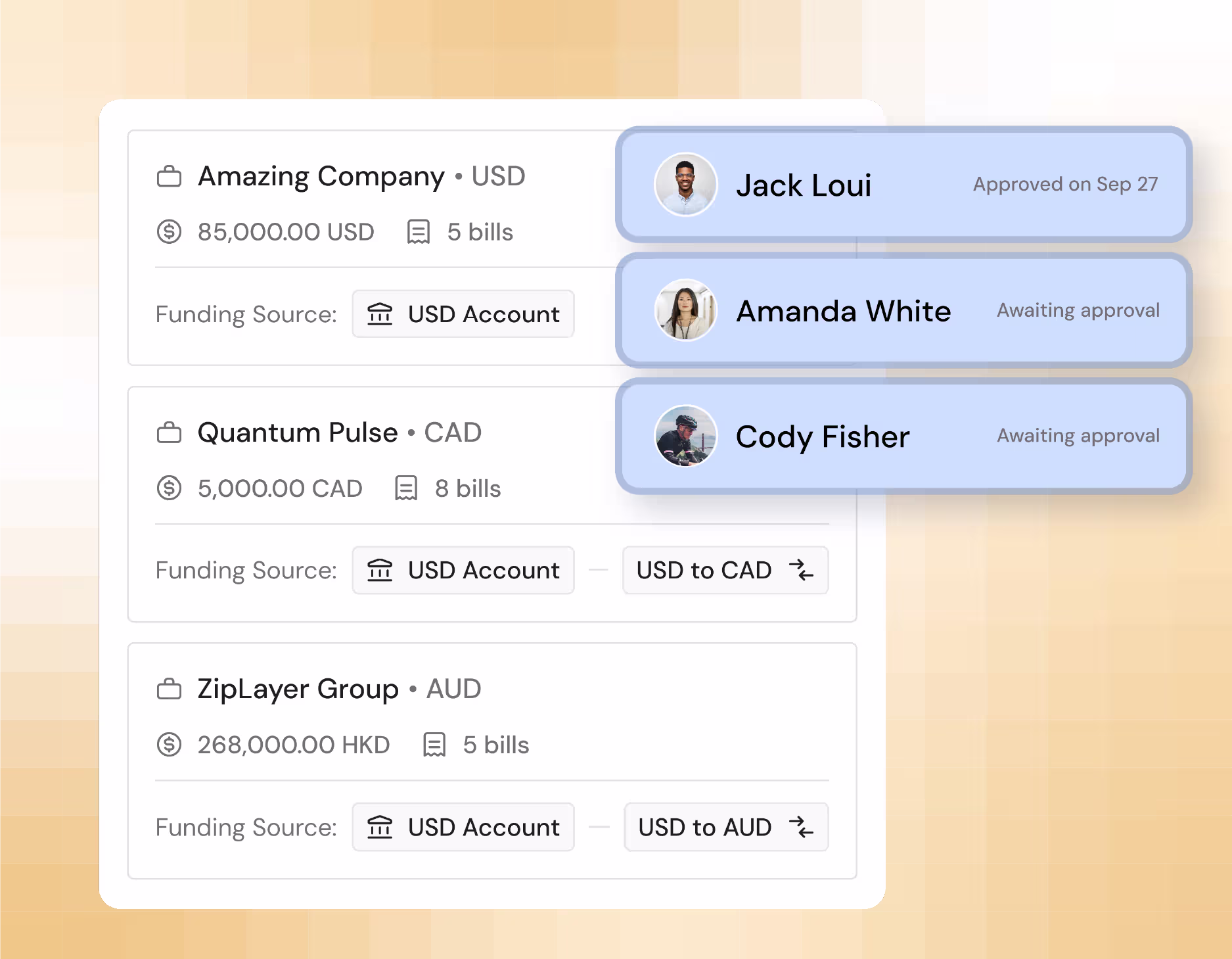 Approvers see more than just totals. Every batch shows currencies, conversions, and exceptions in one view.