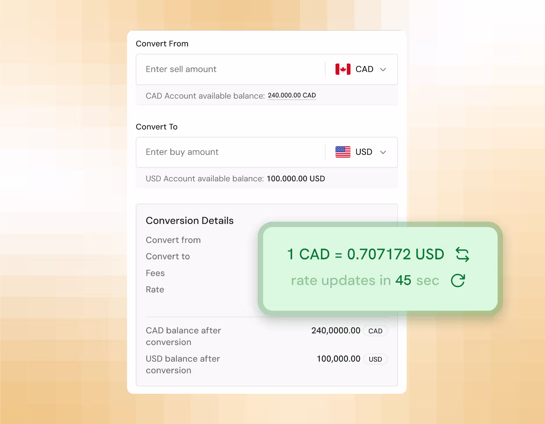 Dashboard view of multi-currency balances (USD, CAD, EUR) with a currency converter module showing real-time FX rates and a “Convert” button.